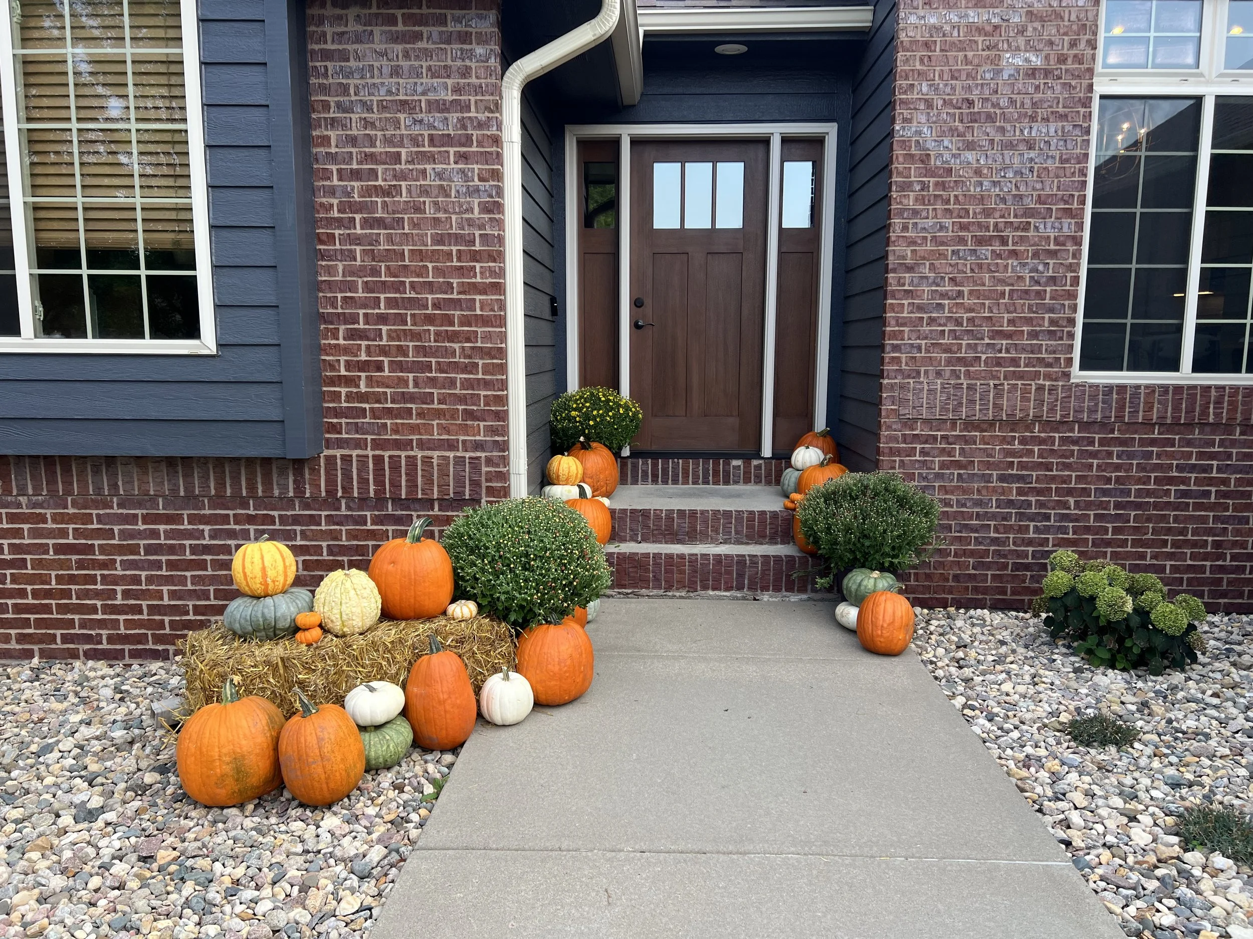 Decorated Doorsteps is here to bring the beauty of Fall to your front porch or doorstep in the Metro Area (Sioux Falls, Harrisburg, Brandon Valley, Tea area). We deliver and set up a seasonal display that includes pumpkins, mums, straw bales, and corn stalks—perfect for porches with pillars and space to showcase them.